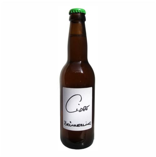 Die kleine Flasche ist mit einem handgeschriebenen Etikett verziert. Auf dem hinteren Etikett ist Apfelperlwein und 6 % Alkohol sowie 0,33 l vermerkt.