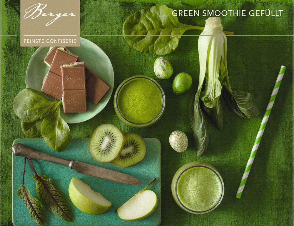 Die im Jahr 2017 angesagte Farbe „Greenery“ wird nicht nur im Packaging von der österreichischen Manufaktur gekonnt aufgenommen, sondern findet sich darüber hinaus auch geschmacklich wieder, zum Beispiel in der Schokoladentafel „Karotte-Honig gefüllt“ oder „Green Smoothie gefüllt“.