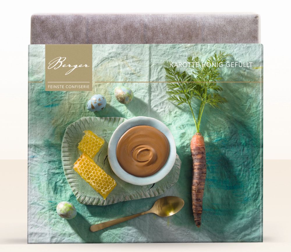 Gaumen und Geschmack: Cremig, zarter Schmelz, sehr schokoladig. Nur das Innere einzeln genossen steht der Honig im Vordergrund, die Karotte lässt sich nur erahnen.