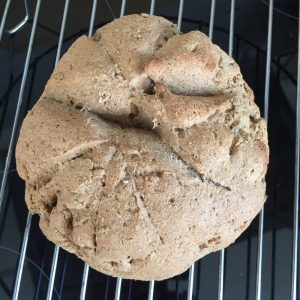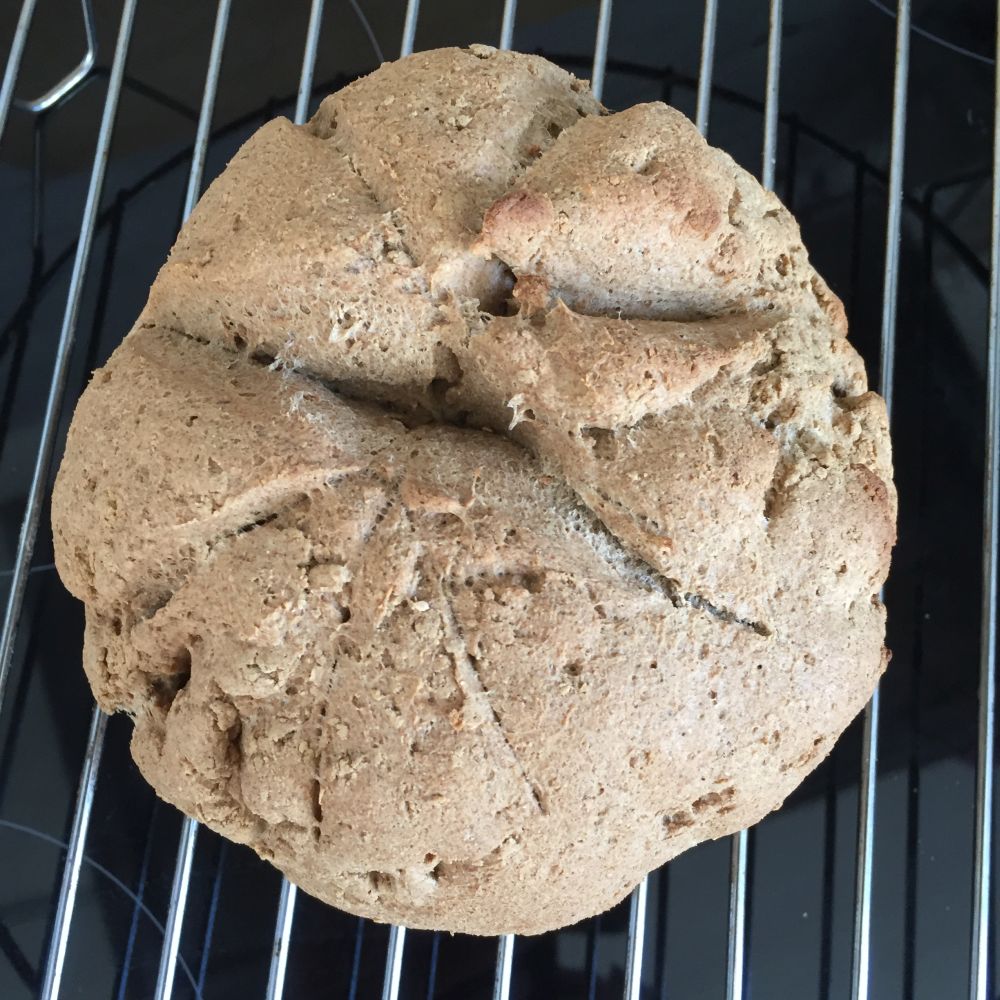 Das Ergebnis kann sich sehen lassen. Allerdings war die Backzeit für unseren Ofen zu kurz, wir mussten noch etwas nachlegen. Das Brot ist grobporig und locker.