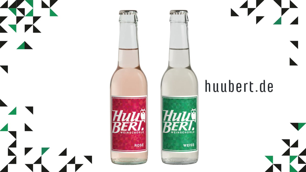 Zu der Huuubert Produktpalette gehören Huuubert Weinschorle weiss, Huuubert Weinschorle rosé, sowie die Weincocktails Huuuber Gurke-Ingwer und Rosmarin-Zitrone.
