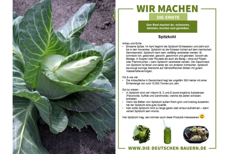 Einsame Spitze: Im April beginnt die Spitzkohl Erntesaison. Spitzkohl ist nach RLV-Angaben die früheste Kohlart auf dem heimischen Gemüsemarkt. Spitzkohl kann sehr vielfältig verarbeitet werden: Er schmeckt roh, gedünstet, gekocht, geschmort und gebraten. Sowohl als Beilage, in Suppen oder Roulade als auch als Belag – etwa auf Pizzen oder Flammkuchen – kann Spitzkohl verarbeitet werden. Der Geschmack von Spitzkohl ist feiner und zarter als von anderen Kohlsorten. Spitzkohl bevorzugt sonnige Standorte auf nährstoffreichen Böden mit gutem Wasserhaltevermögen. Die Anbaufläche in Deutschland liegt bei ungefähr 500 ha mit einer Erntemenge von rund 10 000 t pro Jahr.