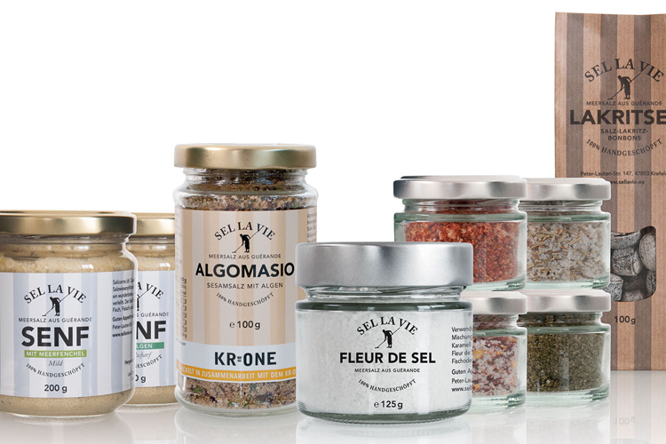 Salzspezialitäten mit Gewürzen wie Chili, Curry, Basilikum, Rosmarin und viele andere Geschmacksrichtungen, Senfsorten verfeinert mit Fleur de Sel oder verschiedene Brotaufstriche.