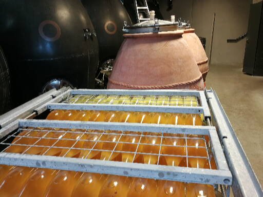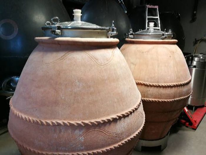 Vor der Verkostung haben wir uns die großen und imposanten Beton-Amphoren angeschaut. Neu sind auch die Ton-Kvevri, siehe unten das Foto!