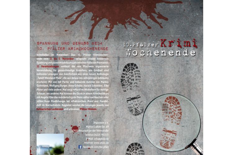 Zum Jubiläum verspricht das 10. Pfälzer Krimiwochenende vom 3. bis 5. November 2017 extra viel knisternde Spannung. Da sorgt der »Tod im Woikeller« für wohlige Schauer und die Gäste stillen ihren Mordshunger bei »Makrönchen, Mord und Mandelduft im Bücherhotel«. Insgesamt 22 Veranstaltungen umfasst die von der Pfalzwein-Werbung organisierte Veranstaltung für genussfreudige Krimifans, darunter sind viele Premieren. Außerdem gibt es zahlreiche exklusive Lesungen von Geschichten aus der neuen Anthologie »Tatort Weinland Pfalz«, die aus Anlass dieses zehnjährigen Jubiläums erscheint. Mit von der Partie sind bekannte Autoren wie Markus Guthmann, Wolfgang Burger, Anne Grießer, Harald Schneider, Elke Pistor und viele andere. Begleitet werden die Lesungen jeweils von kulinarischen Leckereien und erlesenen Pfälzer Weinen.