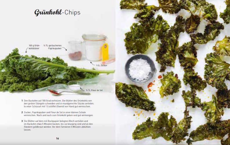 Jedes Rezept findet auf einer einzigen Doppelseite Platz: Optisch ideal aufbereitet mit einer Darstellung der Zutaten, Arbeitsmaterialien und den Ergebnis. Dazu die Instruktionen für Zutaten, Material und Arbeitszeit sowie in meist ein bis drei Schritten die Ausführung. Dazu teilweise noch Pfeile zu den Bestandteilen mit entsprechenden Erklärungen. So findet sich der Koch intuitiv durch das Rezept und offene Fragen werden nicht durch ewiges Nachlesen sofort geklärt. Ob jeder das dann in zehn Minuten schafft, sei noch dahin gestellt, aber der Ansatz ist verständlich, einfach und logisch.