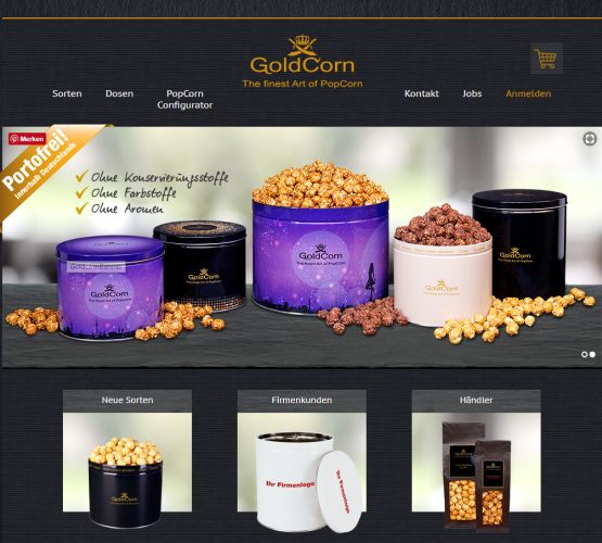 Die Firma Goldcorn produziert und veredelt Popcorn nach eigenen Rezepten ohne Konservierungsstoffe, Geschmacksverstärkern, Farbstoffen, und Aromen.
