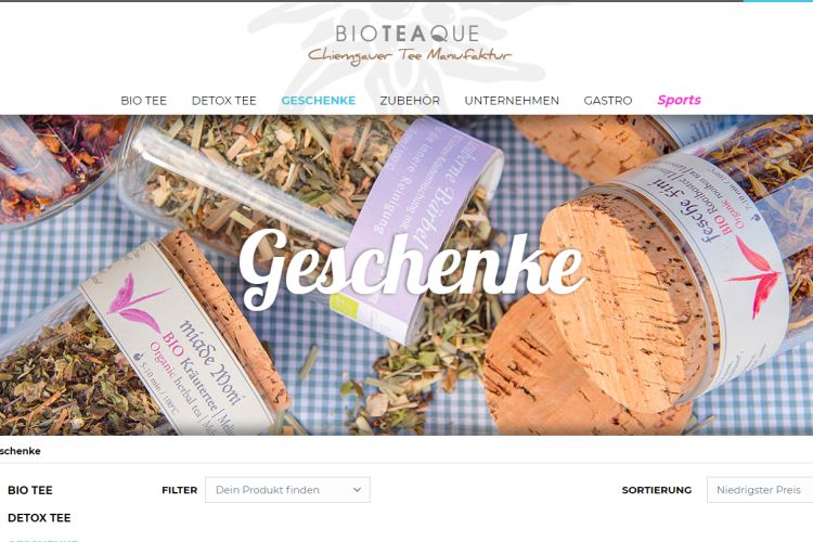 Das Angebot fängt mit einer großen Auswahl an Bio-Tees an und reicht von Detox-Tee bis zu einer Zubehör-Auswahl und Geschenken.
