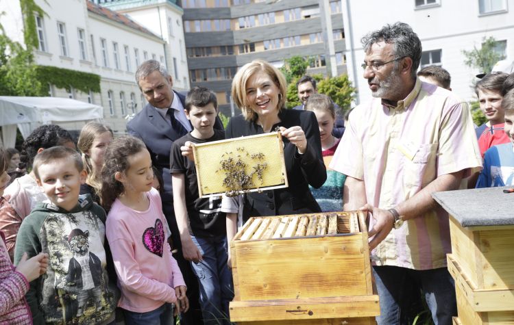 Bundesministerin Klöckner betonte: „Wir heißen heute unsere neusten Mitarbeiter willkommen: unserer beiden Bienenvölker. Ich freue mich sehr, dass wir am 20. Mai den ersten Weltbienentag feiern, um die große Bedeutung dieses kleinen Nutztiers in den Fokus zu rücken. Bienen sind systemrelevant. Auch wenn sie klein sind, ihre Wirkung ist immens groß: Stellen Sie sich eine Welt ohne Bienen vor – wir hätten weniger Obst, Gemüse und Blumen. Unser Gast, mein slowenischer Kollege Dejan Židan, hat den ersten Weltbienentag initiiert – mit deutscher Unterstützung. Wir starten heute die deutsch-slowenische Bienen-Allianz: Wir haben vereinbart, unsere wissenschaftliche Zusammenarbeit im Imkerbereich zu intensivieren. Und wir wollen bei Verhandlungen zur Gemeinsamen Agrarpolitik nach 2020 gemeinsam vorgehen, um bienenfreundliche Maßnahmen noch effizienter zu fördern. Wir fördern bereits die Aussaat von speziell auf Bienen zugeschnittenen Blühpflanzen. Hier leisten die Landwirte einen wichtigen Beitrag: Es ist besonders erfreulich, dass wir heute auch die bäuerlichen Familien mit an Bord haben. In den kommenden Wochen will ich weitere Partner für unsere Bienen-Allianz gewinnen. Wir alle können gemeinsam mehr tun: Wir haben hier in meinen Haus bereits bienenfreundliche Blumen angepflanzt. Je günstiger die Nahrungsgrundlage für die Bienen ist, desto robuster sind sie gegenüber Krankheiten und Umwelteinflüssen. Wir haben unsere Kampagne „Bienen füttern!“ neu aufgelegt: Mit unserer Bienen-App und in Zusammenarbeit in über 500 Gartencentern in ganz Deutschland kann man sich informieren, welche Pflanzen als „Bienenbüffets“ geeignet sind. Zahlreiche Menschen engagieren sich bereits und gestalten Balkone und Gärten mit dem wichtigen Bienenfutter. Ich habe auch alle anderen Ministerien und die Bundesländer eingeladen, mitzumachen und mit Bienenfutter auf ihren Außenflächen, einen aktiven Beitrag zum Bienenschutz zu leisten. Das müssen uns die Bienen wert sein. Auch die vielen kommunalen Unternehmen und der Bauernverband sind dabei. Dafür will ich heute im Namen der Bienen „Danke“ sagen.“