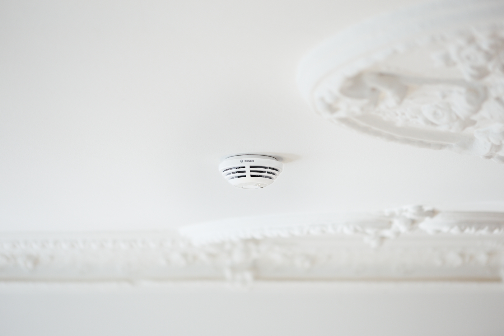 Hier ist im Vordergrund am Kabel der Smart Home-Controller zu sehen, an der Decke im Hintergrund links der Rauchmelder (Foto: Bosch)