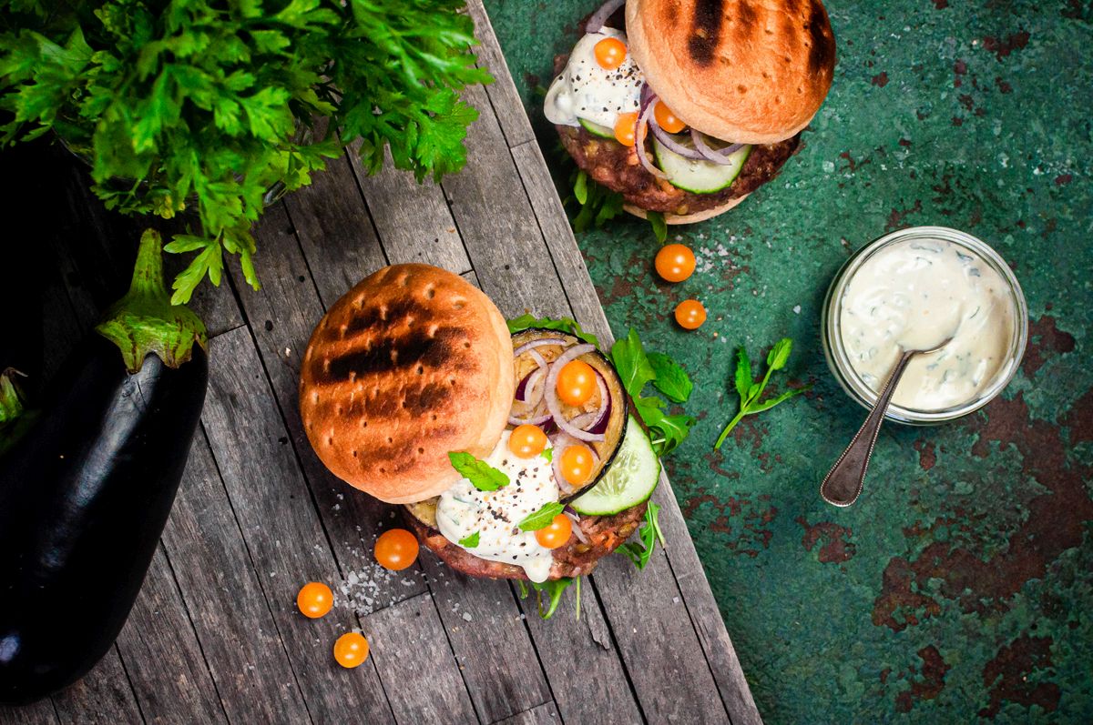 Linsen-Kichererbsen-Burger mit Aubergine und veganem Minz-Dip