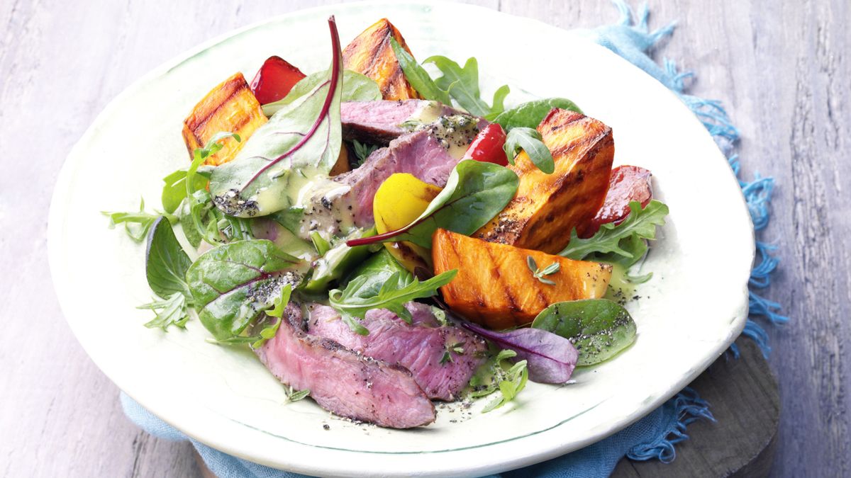 Salat von gegrillten Süßkartoffeln mit Rinderhüftsteaks