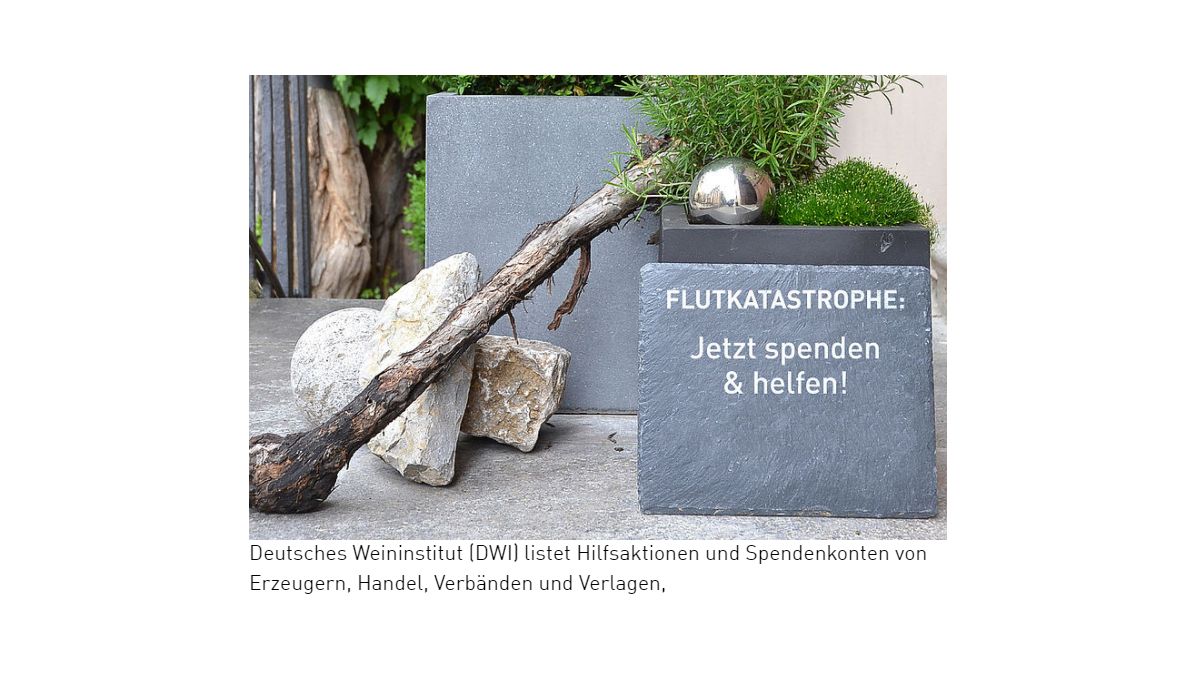 An der Ahr stehen zahlreiche Weinerzeuger vor dem Nichts: überflutete Büros, Keller und Weinlager, zerstörte Maschinen. Das Deutsche Weininstitut (DWI) listet Spendenaufrufe sowie Hilfsaktionen von Weinerzeugern, Handel, Verbänden und Organisationen, an denen Sie sich beteiligen können. Verschiedene Weinpakete, Sonderspenden bei Bestellungen, der Weinköniginnen-Weine und viele andere Ideen sollen helfen. Lesen Sie hier: