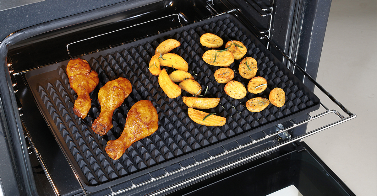 Die praktische Pyramiden-Struktur sorgt für eine gleichmäßige Zirkulation der Hitze und somit für einen Umluft-Effekt. Überschüssiges Fett kann zudem einfach in die Vertiefungen abtropfen. Auf diese Weise muss das Backgut nicht gewendet werden und schmort gleichzeitig nicht im eigenen Saft. So gelingt ein rundherum gleichmäßig knuspriger sowie fettreduzierter Gaumenschmaus.