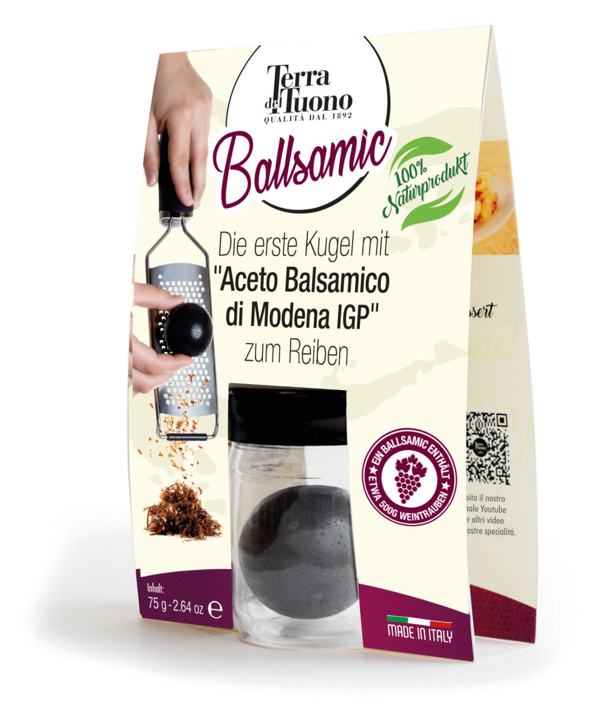 Die Balsamico-Kugel, der „Antica Acetaia della Marchesa“, besteht aus rund fünf hundert Gramm Weintrauben, welche durch spezielle Behandlung entsteht. Viele Genießer kennen Balsamico, welcher aus einer Mischung aus Weinessig und eingekochtem Traubenmost besteht, in flüssiger oder cremiger Form. Mit der gehobelten Variante des Balsamicos können Sie Ihren Speisen jetzt einen ganz besonderen Kick geben und so für ein besonderes „Aha“-Erlebnis bei Tisch sorgen.
