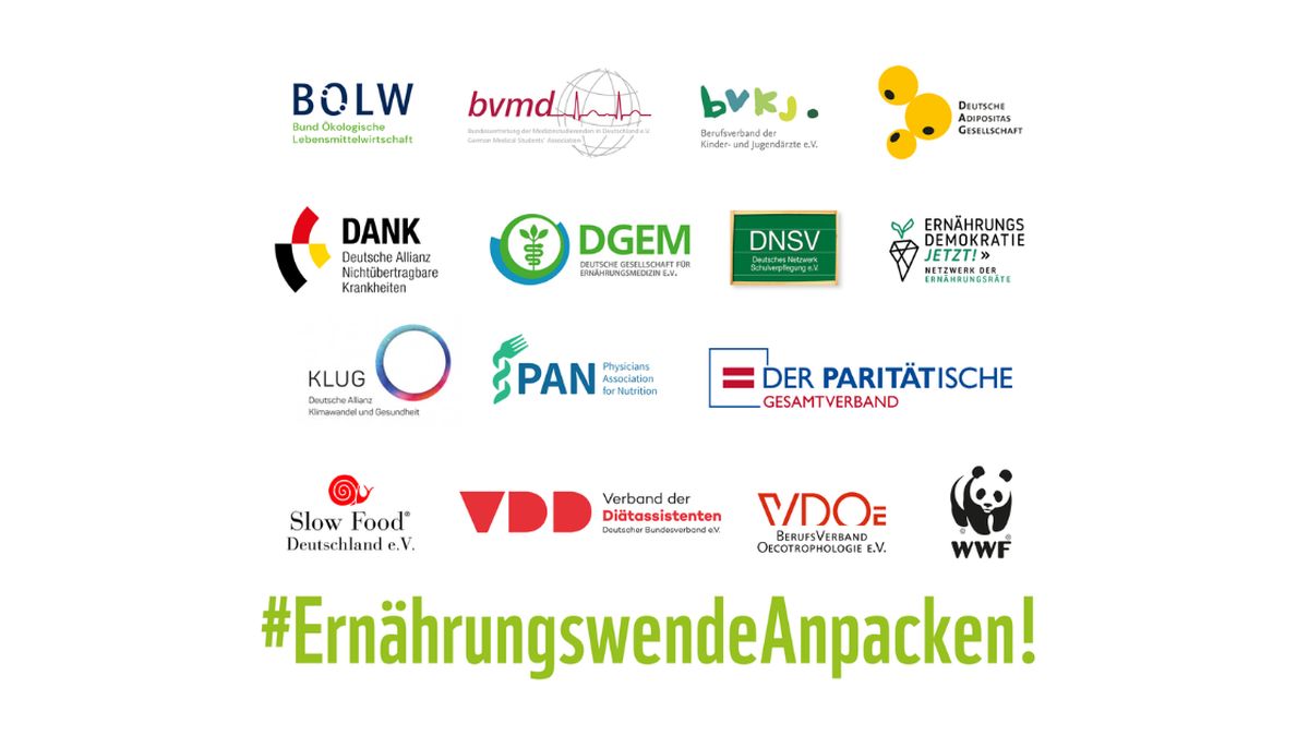 Der Appell wird getragen von: Berufsverband der Kinder- und Jugendärzte e. V. (BVKJ), Bundesvertretung der Medizinstudierenden Deutschland e.V. (bvmd), Bund Ökologische Lebensmittelwirtschaft e.V. (BÖLW), BerufsVerband Oecotrophologie e. V. (VDOE), Deutsche Adipositas Gesellschaft e.V. (DDAG), Deutsche Allianz Klimawandel und Gesundheit (KLUG), Deutsche Allianz Nichtübertragbare Krankheiten (DANK), Deutsche Gesellschaft für Ernährungsmedizin e.V. (DGEM), Deutsches Netzwerk Schulverpflegung e.V. (DNSV), Ernährungsräte, Paritätischer Gesamtverband, Physicians Association for Nutrition (PAN), Slow Food Deutschland e.V. (SFD), Verband der Diätassistenten – Deutscher Bundesverband e.V. (VDD), World Wide Fund for Nature Deutschland (WWF). Initiiert wurde er von der Umweltschutzorganisation WWF Deutschland