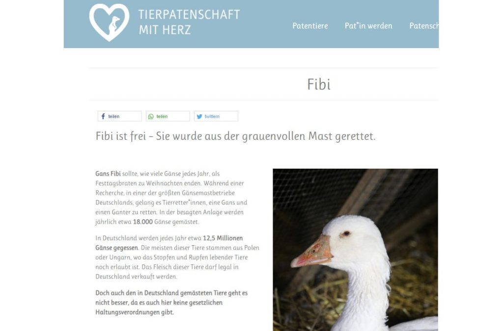 Das Projekt „Tierpatenschaften mit Herz“ des Vereins Deutsches Tierschutzbüro e.V. ist seit vielen Jahren aktiv. Nun können Sie Ihren Lieben alternativ zum Weihnachtsbraten eine Tierpatenschaft für ein gerettetes Tier schenken! Lesen Sie hier die Geschichte der Gans Fibi, welche aus der Massenhaltung gerettet wurde.