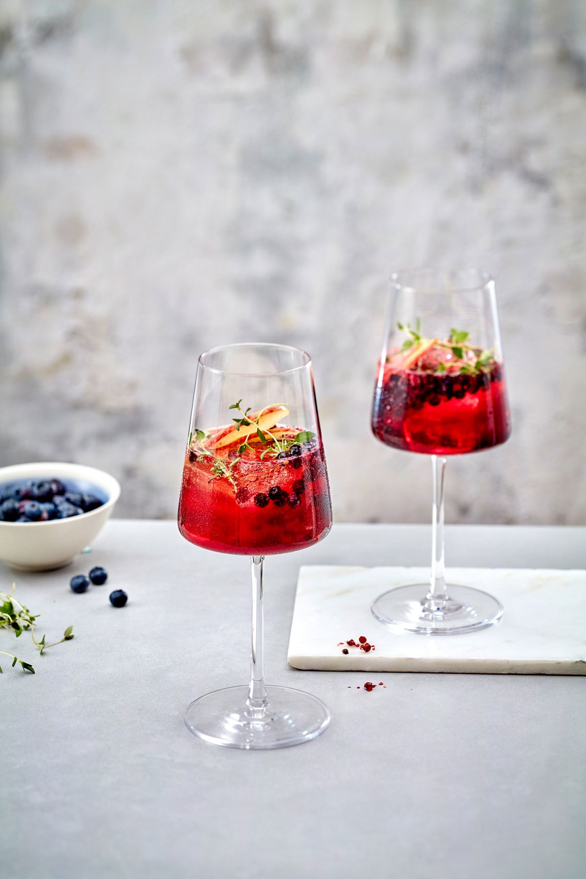 Gründe zum Anstoßen? – Gibt es immer und mit dem fruchtig-frischen Henkell Alkoholfrei Blueberry-Spritz geht das sogar komplett vegan und ohne Alkohol! Der duftende Drink schmeckt nicht nur köstlich, er ist auch optisch ein richtiger Hingucker: Der helle Rotton in Verbindung mit den blauen Heidelbeeren und den grünen Thymian-Zweigen versprechen ein stimmiges Gesamtbild.