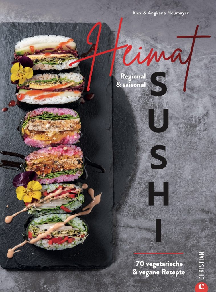 In dem Buch Heimat Sushi stellen die Autoren Alex und Angkana Neumayer ihre Interpretation von Sushi mit regionalen, vegetarischen oder auch rein veganen Zutaten vor. Mit diesen Rezepten gelingt es, diese asiatische Köstlichkeit komplett nachhaltig und mit regionalen Zutaten herzustellen. Insgesamt siebzig Variationen sollen inspirieren und zum Nachkochen anregen. Die Auswahl reicht von »Sushi mit Apfel & Apfelblüte« über »Brokkoli-Nigiri« und »Kürbis-Temaki« bis zu »Inari mit roter Bete«.