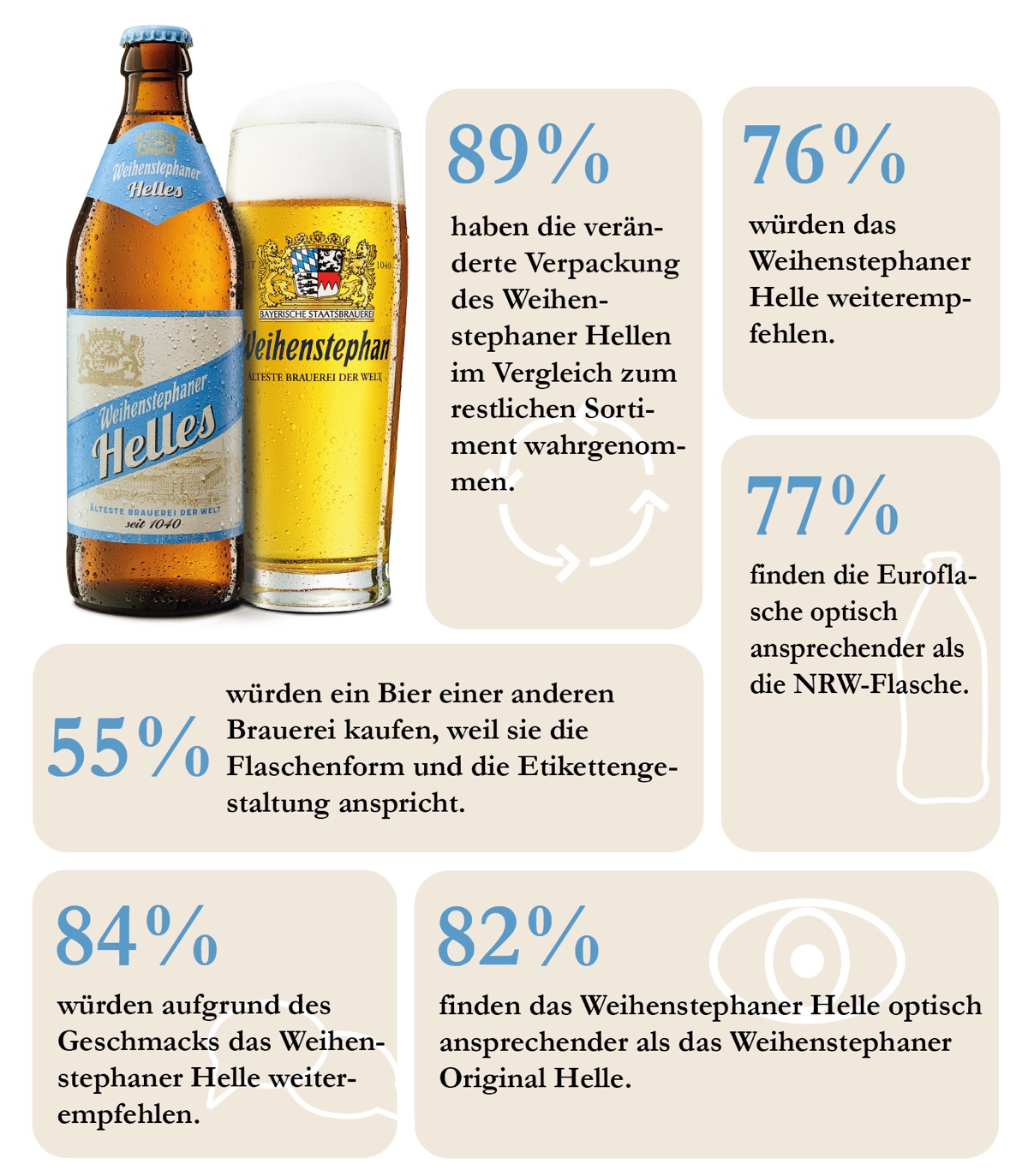 Herausgekommen ist ein aromatisches Gesamtkunstwerk, das die Philosophie der Bayerischen Staatsbrauerei Weihenstephan hervorragend repräsentiert: höchste Braukunst mit traditionellen wie auch modernen Einflüssen hergeleitet. Die Rückbesinnung auf authentische Biere im Retrostil, abgefüllt in der Euroflasche, soll speziell eine Zielgruppe ab 20 Jahren ansprechen. 89 Prozent aller Befragten haben Veränderungen in der Verpackungsgestaltung des Weihenstephaner Hellen im Vergleich zum restlichen Sortiment der Brauerei wahrgenommen. Das Design des Weihenstephaner Hellen wurde auch von den Umfrageteilnehmern als modern, lässig, ansprechend und trendig beschrieben. Damit beweist die älteste Brauerei der Welt, dass sie trotz ihrer jahrelangen Tradition ein sehr modernes Unternehmen, nicht nur in der Braubranche, sondern auch im Marketing ist.