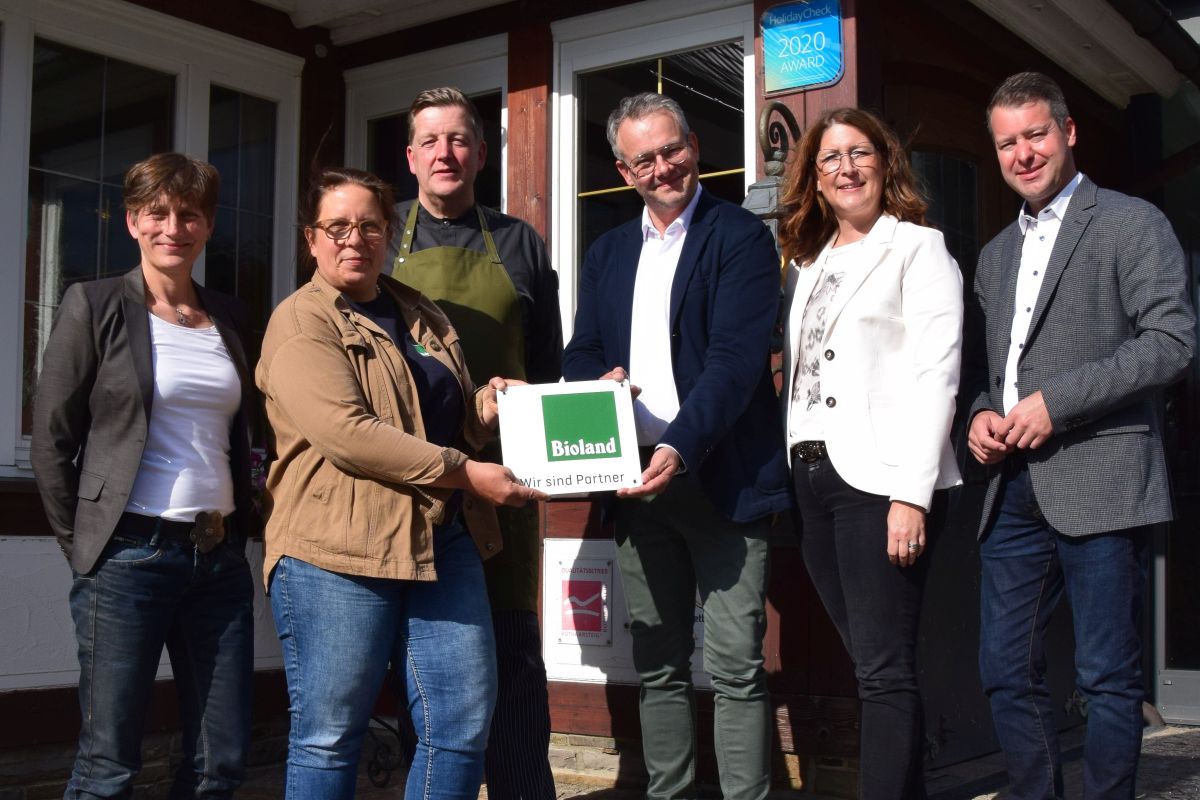 Bereits seit 2000 können sich gastronomische Betriebe Bioland-zertifizieren. Bioland ist damit der Pionier der Branche. 2018 wurde beim Bio-Verband ein neues Gastronomie-Konzept eingeführt, das die Partnerbetriebe – je nach Bioanteil – mit den Status Gold, Silber und Bronze kennzeichnet. Ab einem Anteil von 90 Prozent wird der Gold-Status vergeben.