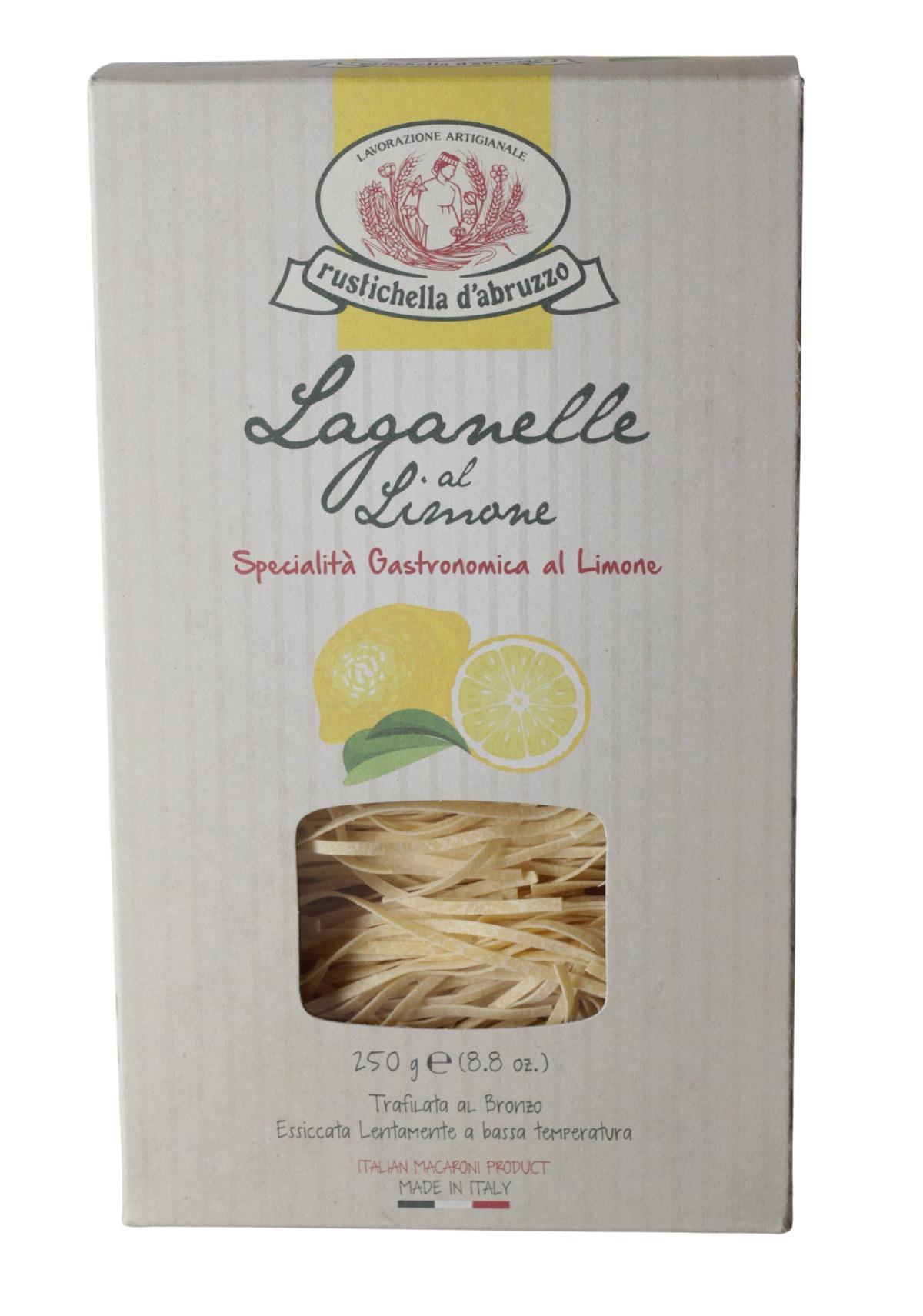 Zum Fisch ist diese Nudelspezialität ein ganz besonderes Geschmackserlebnis: Die Zitronen-Pasta Laganelle al Limone der Manufaktur Rusticella d‘Abruzzo. Eine Besonderheit ist die Herstellung mit handgeschmiedeten Werkzeugen aus Bronze, die jede Nudel zu einem Unikat machen. Außerdem sort die lange Trockenzeit für eine besonders rauhe Oberfläche, welche für Bissfestigkeit und gute Aufnahme von Sauce sorgt.