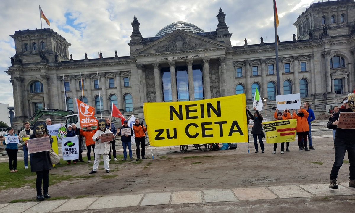 Anlässlich des fünften Jahrestages von CETA hat foodwatch gefordert, die Ratifizierung des Abkommens zu stoppen und stattdessen einen neuen Handelsvertrag mit Kanada zu verhandeln. Aktivist:innen protestierten daher heute vor dem Deutschen Bundestag. Dazu erklärt Rauna Bindewald von foodwatch: