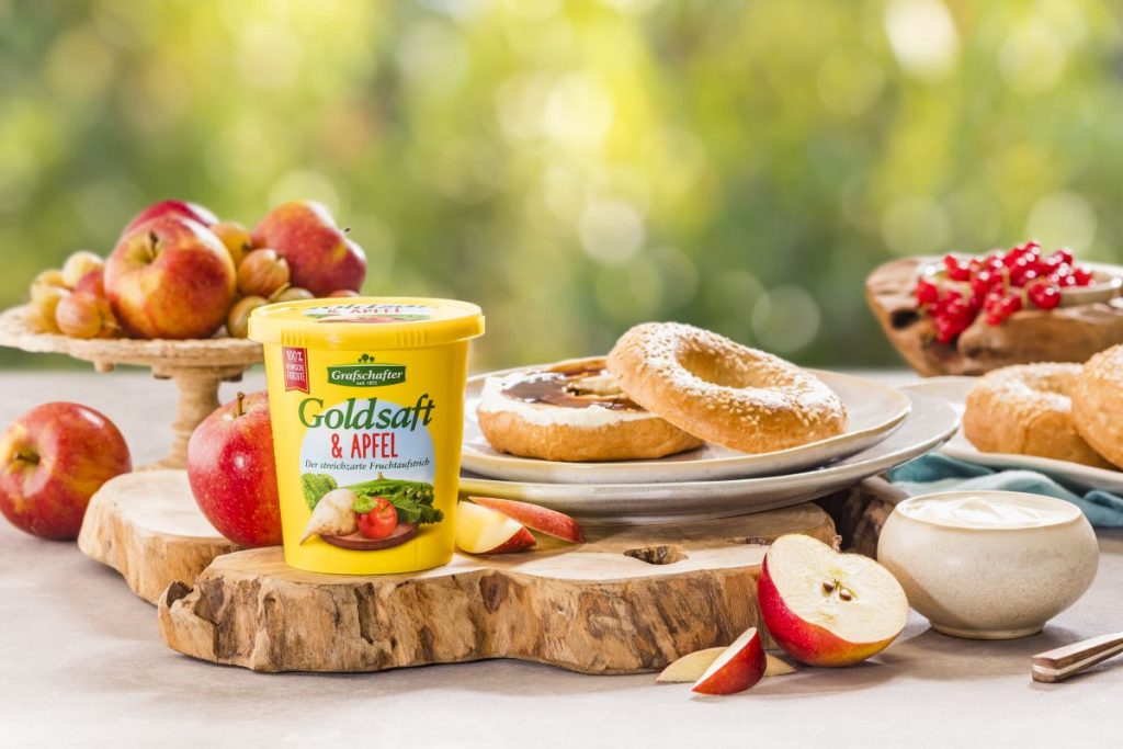 Der klassische Goldsaft Zuckerrübensirup von Grafschafter hat einen Partner bekommen. Die neue Variation besteht aus dem Zuckerrübensirup und frischen Äpfeln. Dazu passt hervorragend dieses Rezept von süßen Bagels, die den neuen Aufstrich bestens zur Geltung kommen lassen. Auch dieser Aufstrich wurde komplett ohne Zusatz von Aromen, Farb- und Konservierungsstoffen produziert und kostet im UVP 1,99 Euro.