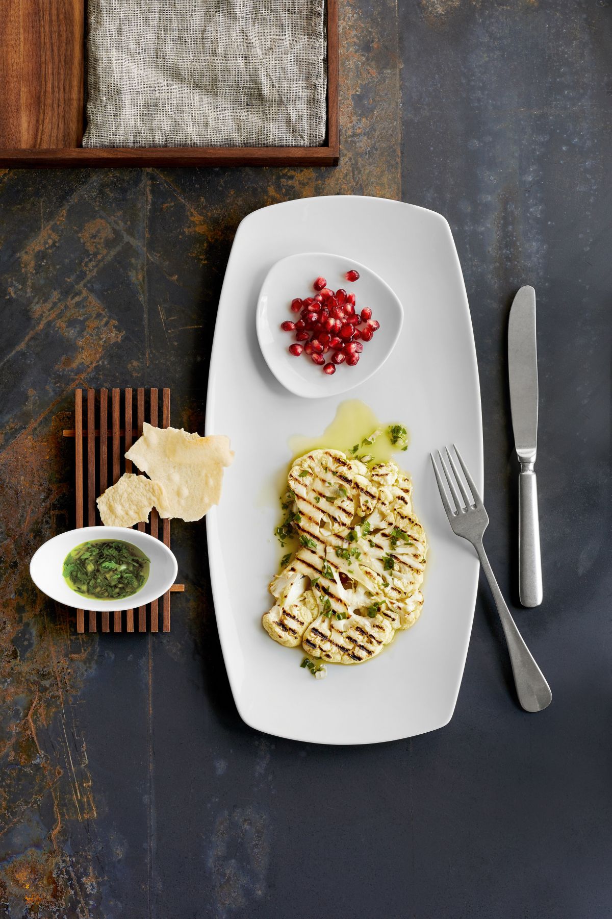 Grillen ist für viele Gäste und Chefs das neue Kochen und hat sich – ob Outdoor oder Indoor – als Ganzjahres-Hit etabliert. So abwechslungsreich wie das Gut auf dem Grill sind die Präsentationsmöglichkeiten auf den Porzellankollektionen von Bauscher. So bringt die Platte aus der puristischen Porzellankollektion Options das gegrillte Blumenkohlsteak appetitlich zur Geltung – weitere Beilagen werden auf kleinen Tellern und in Schälchen gereicht. Die Kollektion ist eine der umfangreichsten von Bauscher und hat neben den Platten auch Coupteller, Hohlteile, Schüsseln und kleinere Tisch-Accessoires im Sortiment, die sich immer wieder neu kombinieren lassen.