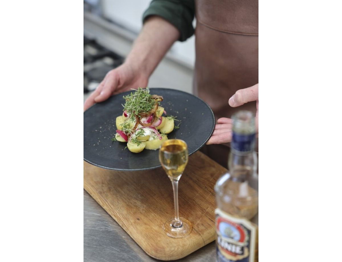 Warum nicht einmal den Jahreswechsel wie die Skandinavier feiern! Dazu gehört eine Mischung aus Party, gutem Essen und Brauchtum. LINIE Aquavit präsentiert dazu ein Kartoffel-Smørrebrød mit LINIE-Mayo. Am Vortag werden dazu Zwiebeln mit einer besonderen Gewürzmischung in Aquavit eingelegt. Am Tag selbst werden die Kartoffeln gekocht und in mundgerechte Stücke geschnitten. Dann wird die Mayonnaise mit Eigelb, Dijon-Senf und Aquavit zubereitet. Dazu passt der Drink „Linie Ginger“.