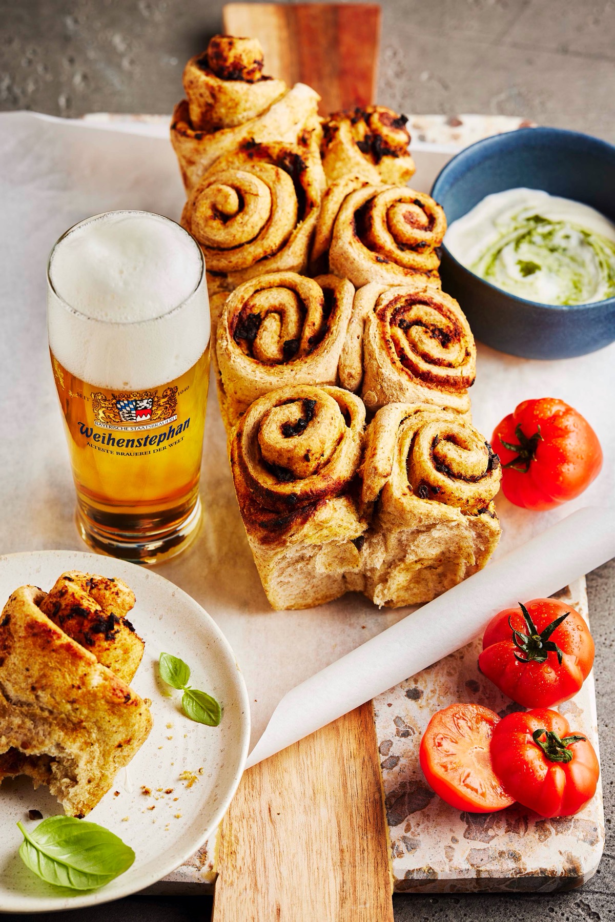 Tomaten, Oliven und veganes Pesto geben dem Zupfbrot die perfekte Würze. Das passt zu gegrillten Speisen oder auch solo bei vielen Gelegenheiten. Die Basis bildet ein Dinkel-Hefe-Teig. Das Pesto wird aus Pinienkernen, Basilikum und Olivenöl selbst hergestellt. Tomaten und Oliven werden klein gehakt. Diese Zutaten werden auf dem ausgerollten Teig verteilt, dieser dann in Stücke geschnitten, welche dann gerollt und hochkant in eine Kastenform gestellt werden. Dazu passt natürlich auch ein leckeres Bier. Die Weihenstephan Brauerei hat uns freundlicherweise dieses Rezept zur Verfügung gestellt.