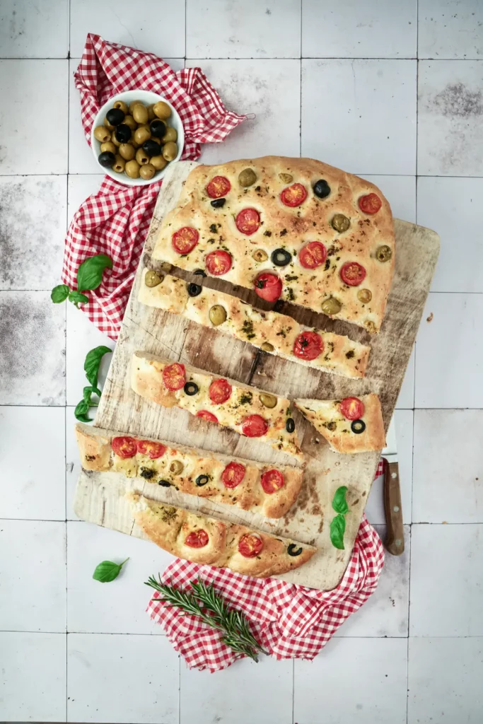 Focaccia wird in Italien vielseitig verwendet, ob als Beilage, Snack oder als Basis für Sandwiches. Sie ähnelt etwas der Pizza, weil es flach ist und ähnlich gebacken wird. Allerdings ist sie aber dicker und wird oft mit Olivenöl, Kräutern und anderen Zutaten wie Oliven, Zwiebeln oder Tomaten belegt, bevor es gebacken wird. Mit Sauerteig statt mit Hefe zubereitet, bekommt die Focaccia eine etwas säuerliche Note und eine fluffige Textur mit schöner Kruste. Auch hilft Sauerteig bei der Verdauung, da das Brot durch den Gärprozess leichter zu verarbeiten ist.