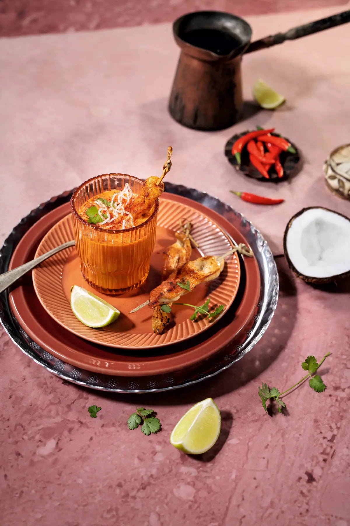 - Kokosmilch und Thai-Chili Sauce in einem Topf aufkochen und mit dem Pürierstab kurz aufschäumen.