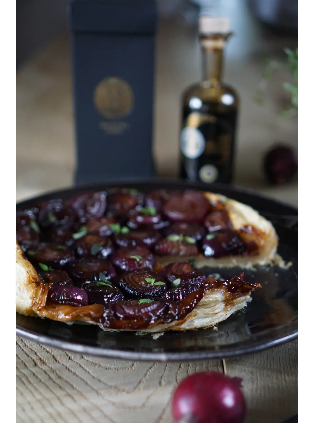 Aceto Balsamico di Modena ist ein geschütztes Produkt mit der geografischen Angabe (g.g.A.) auf der Flasche. Der Herstellungsprozess hat sich über viele Generationen nicht verändert. Der Most von bestimmten Traubensorten wird durch das Eingekocht konzentriert. Schließlich wird er mit zehn Jahre altem Essig gemischt und reift dann mindesten sechzig Tage in Fässern oder Bottichen, die aus besonderem Edelholz bestehen. Es gibt verschiedene Reifegrade und damit auch ganz unterschiedliche Qualitäten. Dieser besondere Essig eignet sich auch zur Zubereitung von feinen Speisen wie die hier vorgestellte Tarte Tatin mit Modeneser Zwiebeln.