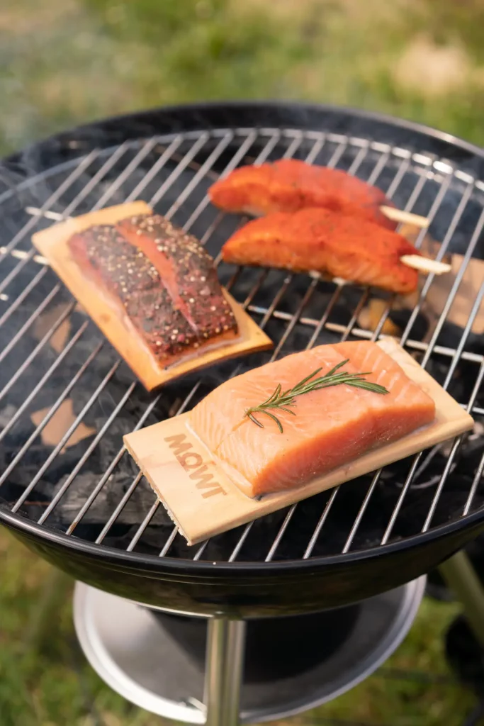 Lachsfilet mit Haut salzen, auf ein gewässertes Zedernbrett legen, mit Dill & Zitronenzesten bestreuen. Bei indirekter Hitze ca. 20 Min. grillen – glasig ist perfekt.