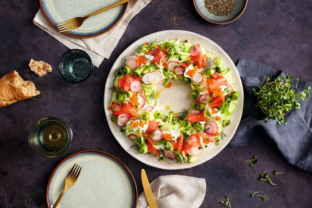 Der festliche Lachs-Avocado-Ring ist ein echter Hingucker auf jeder Tafel und verbindet Frische, Farbe und feinen Geschmack in einem Gericht. Avocado, Fenchel, Gurken und Radieschen sorgen für knackige Texturen, während Räucherlachs und Lachskaviar für das besondere Aroma sorgen. Das Rezept ist einfach zuzubereiten und eignet sich sowohl für festliche Anlässe als auch für sommerliche Buffets. Dank der dekorativen Anordnung in Ringform wird das Gericht zum optischen Highlight, das Gäste sofort begeistert. Serviert mit frischem Baguette, ist der Lachs-Avocado-Ring nicht nur lecker, sondern auch ein Genuss für Augen und Gaumen.