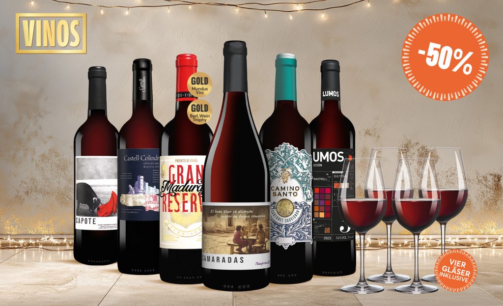 Mit dem Vinos Festwein Paket holen Sie sich sechs sorgfältig ausgewählte spanische Rotweine ins Haus – perfekt für gemütliche Abende, festliche Dinner oder entspannte Stunden mit Freunden. Jeder Wein entfaltet seinen eigenen Charakter: vom fruchtig-eleganten Tempranillo über kräftige Gran-Reserva-Kompositionen bis hin zu vielschichtigen Cuvées, die mit Tiefe und Aroma überzeugen. Ob samtig weich, würzig intensiv oder fruchtig lebendig – diese Auswahl bringt die Vielfalt spanischer Winzerkunst ins Glas. Zusätzlich sorgt ein 4er-Set hochwertiger Weingläser von Schott Zwiesel für den stilvollen Genuss. Eine gelungene Kombination aus Qualität, Genuss und Stil — ideal für die festliche Saison.