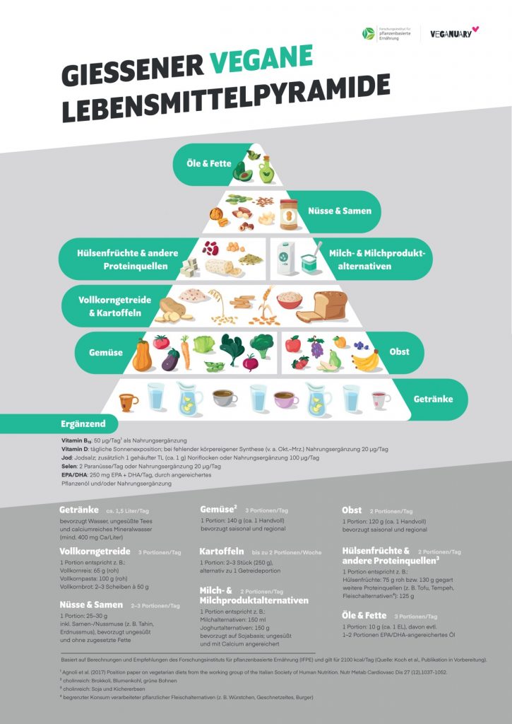 Die Gießener vegane Lebensmittelpyramide wurde erstmals 2018 unter der Leitung von Dr. Markus Keller am IFPE entwickelt (Weder et al., 2018). Sie wendet sich an Menschen, die sich pflanzlich ernähren möchten, und dient zugleich als fachlich fundiertes Instrument für die Ernährungsberatung. Gemeinsam mit Veganuary wurde die Pyramide nun in einer dritten Auflage vollständig neu aufbereitet. Sie bündelt aktuelle wissenschaftliche Ernährungsempfehlungen in anschaulicher Form. Zudem zeigt sie, wie eine pflanzliche Ernährung den Energiebedarf sowie die Versorgung mit Makro- und Mikronährstoffen bei gesunden Erwachsenen sicherstellen kann und unterstützt im Alltag bei der Planung von Mahlzeiten und Einkäufen.