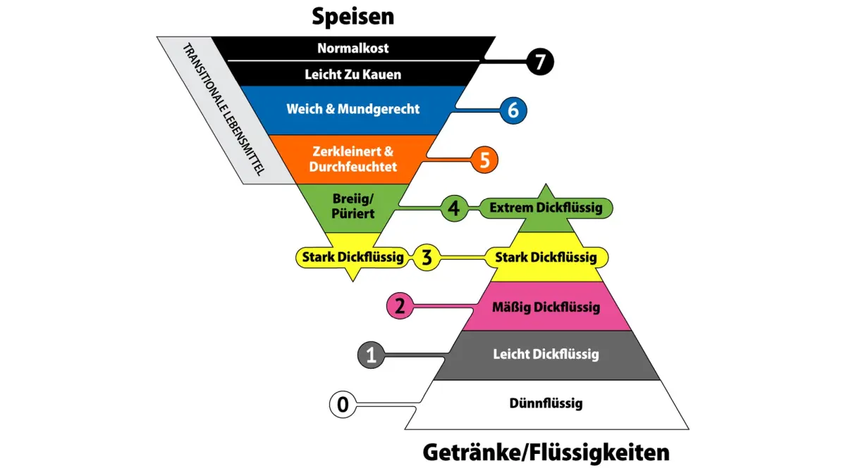 Die IDDSI-Pyramide veranschaulicht die international standardisierten Konsistenzstufen für Speisen und Getränke – von leicht veränderter Textur bis hin zu vollständig pürierten Mahlzeiten und angedickten Flüssigkeiten.