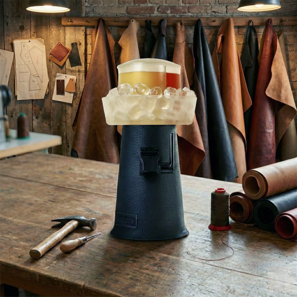 Im Mittelpunkt der Gestaltung steht ein skulpturaler Kegel aus handgefertigtem italienischem Leder. Präzise gesetzte Nähte, klare Linien und hochwertige Materialien verleihen der Luxury-Edition ihren charakteristischen Look. Der Spritz-Dispenser wird dadurch zu einem Objekt, das nicht nur Getränke serviert, sondern zugleich inszeniert.
