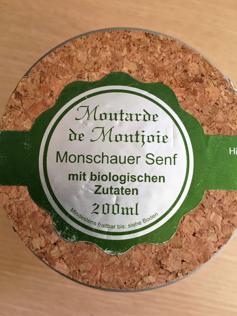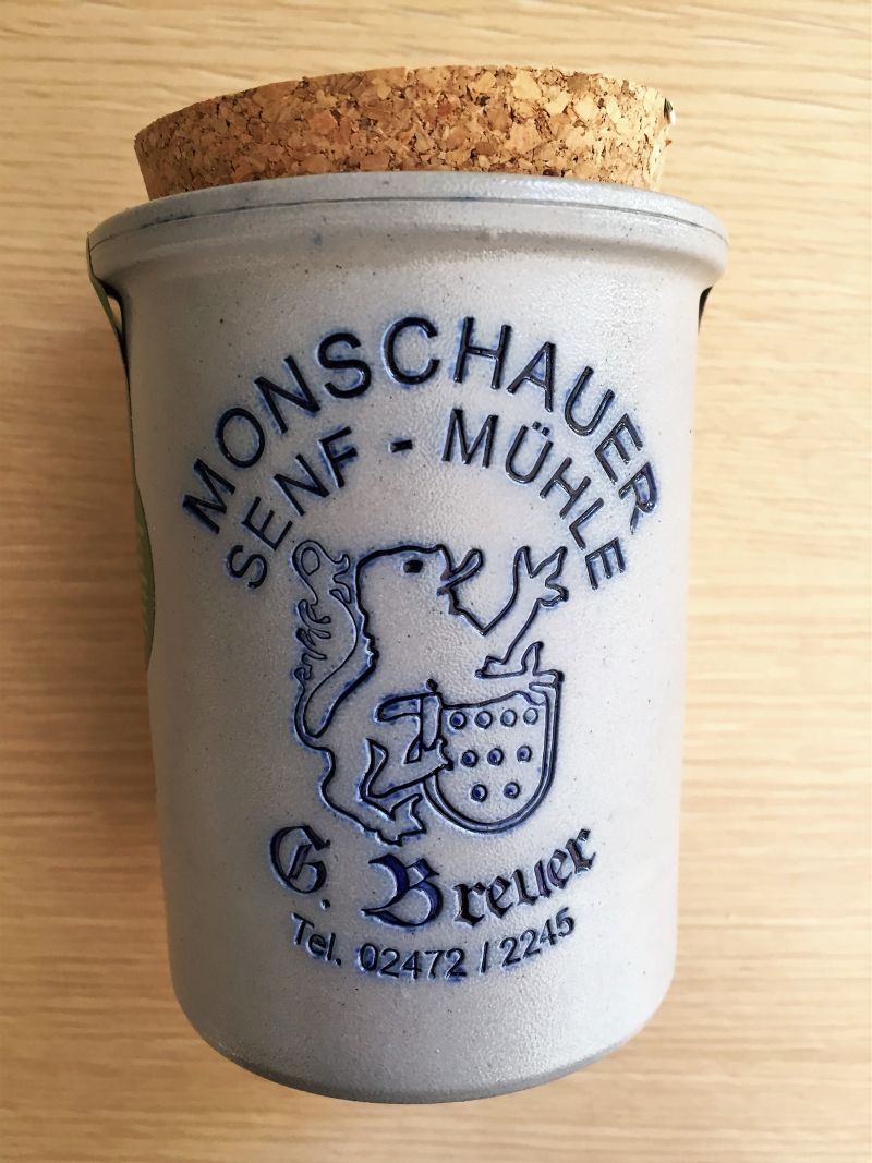 Der Monschauer Senf der Monschauer Senfmühle mit biologischen Zutaten präsentiert sich in einem edlen und sehr dekorativen, klassischem Tontöpfchen mit Wappen und Korkdeckel. „Bio“ verkörpert auch die grüne Banderole.