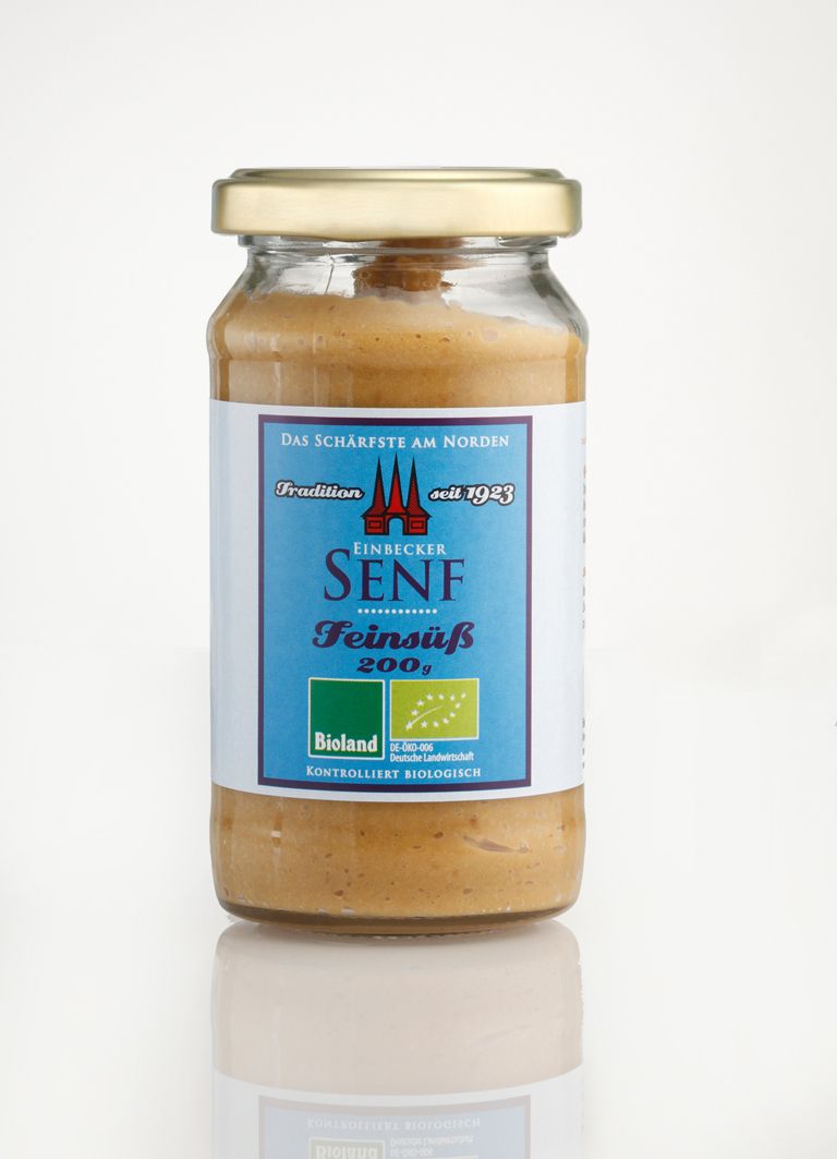 Auf dem 200 Gramm Glas des Einbecker Senfs Feinsüß dominieren die Bioland und EU-Biosiegel. Wie die anderen Einbecker-Sorten hat auch dieses Senfglas ein sehr schlichtes Design.