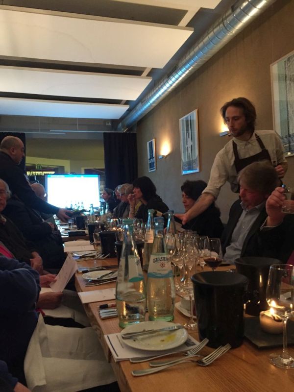 Zur Vorspeise bestehend aus Kopfsalat, Couscous und mediterranem Gemüse wurden uns drei Rotweine der Rebsorten Agiorgitiko, Limniona und Pangeon, einer unbekannten Rebsorte, gereicht. Dieser Wein, der Biblinos Oenos 2011, gefiel uns in dieser Runde am besten. Helle Blüten-Aromen und Gewürznoten führen zu einem satten, adstrigierenden, vollen Mundgefühl mit schöner Säure.