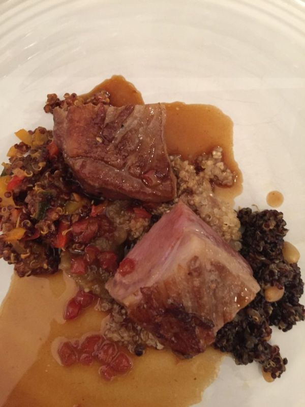 Zum Hauptgang, nämlich Lammrücken mit Keniabohnen und Quinoa waren Weine aus internationalen Rebsorten Merlot, Syrah, Cabernet Sauvignon und Cabernet Franc ausgewählt worden. Hervorzuheben ist hier der Kapnias Red 2009 von der Domaine Hatzimichales, der sich trotz seiner sehr animalischen Einstiegsnote und einer rauchigen Tabakkomponente in einen vollmundigen, langanhaltenden prächtigen Wein entwickelte.