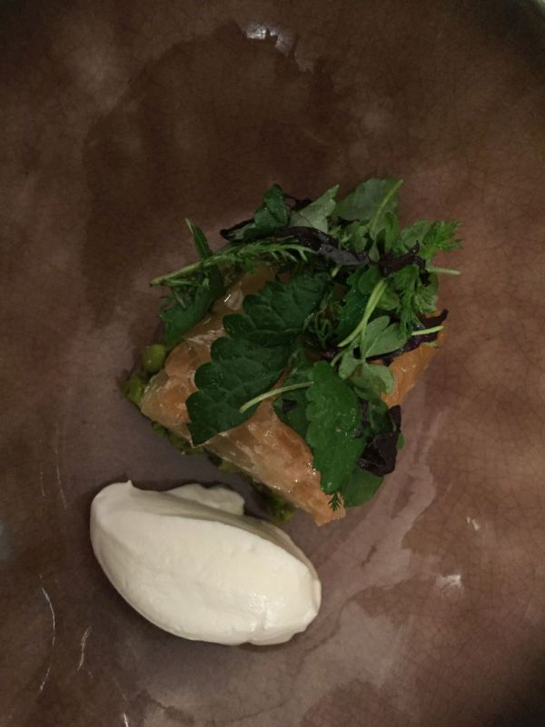 Das Dessert war der griechischer Klassiker Baklava, modern interpretiert mit Pistazien, Salat und einer Frischkäsecreme. Der Vinsanto 2008 der Santo Wines besteht zu 85 % aus Assyrtiko und 15 % aus Aidani. Süsse, kandierte Früchte, Rosinen, aber auch Pflaumenkpott sind die primären Aromen. Im Hintergrund stecken noch leichte Olivenaromen. Dieser gekühlt getrunkene Wein hat eine schöne Balance aus Süße und Säure und einen milden Abgang. Hervorragend.