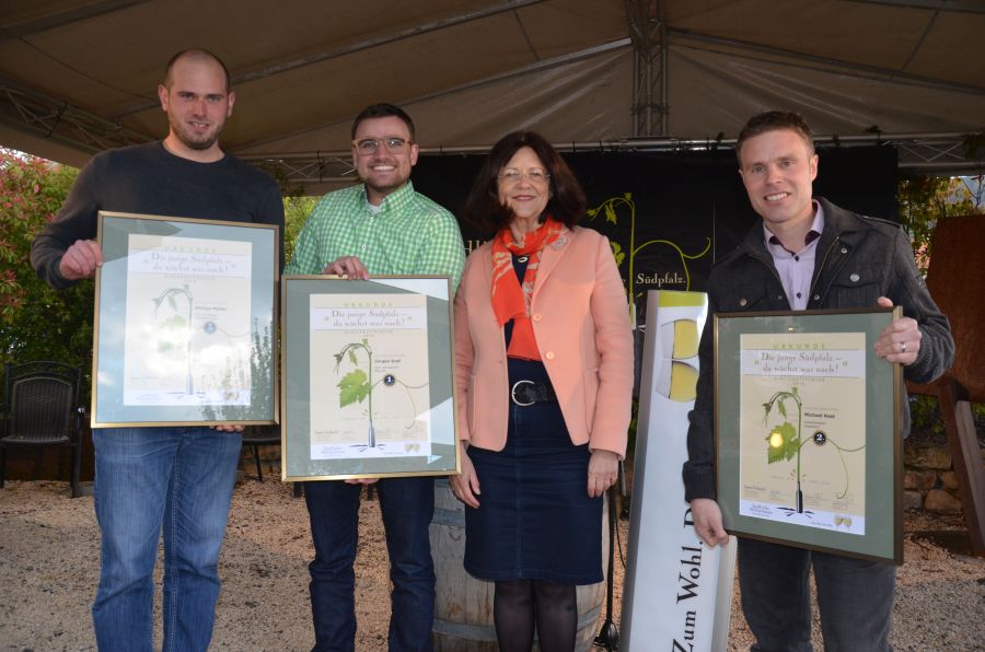 Eine Ehrenurkunde gab es auch für Michael Kast (Ilbesheim) und für Philipp Müller (Gut von Beiden, Kleinfischlingen). Sie belegten nach Jürgen Graf den zweiten und dritten Platz der Gesamtwertung für ihre fünf Weine.
