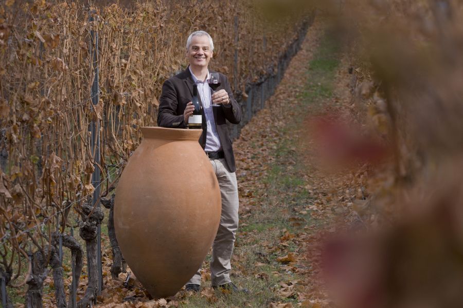 Traditionell wurde bereits in der Antike in Georgien oranger Wein durch Maischegärung hergestellt und in großen, in der Erde vergrabenen Amphoren, aufbewahrt. Der heute „Orange-Wine“ genannte Wein ist Weißwein, der wie Rotwein auf der Maische vergoren wird. Durch den langen Maischekontakt hat der Wein deutlich mehr Gerbstoffe und eine orange Farbe. Nun ist diese Art der Weinherstellung wieder in Mode gekommen. Seit wann produzieren Sie Orangewein und warum haben Sie sich dazu entschlossen?