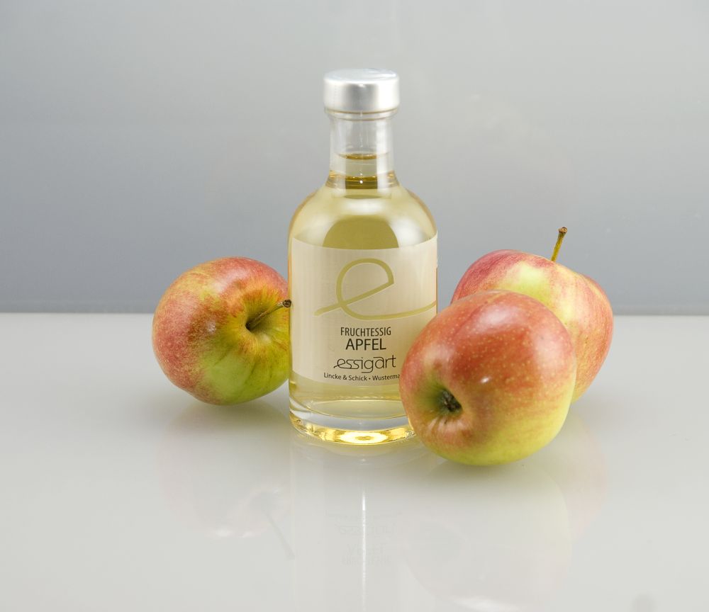 Im klassischen durchgestylten essigart-Design präsentiert sich der Apfelessig.