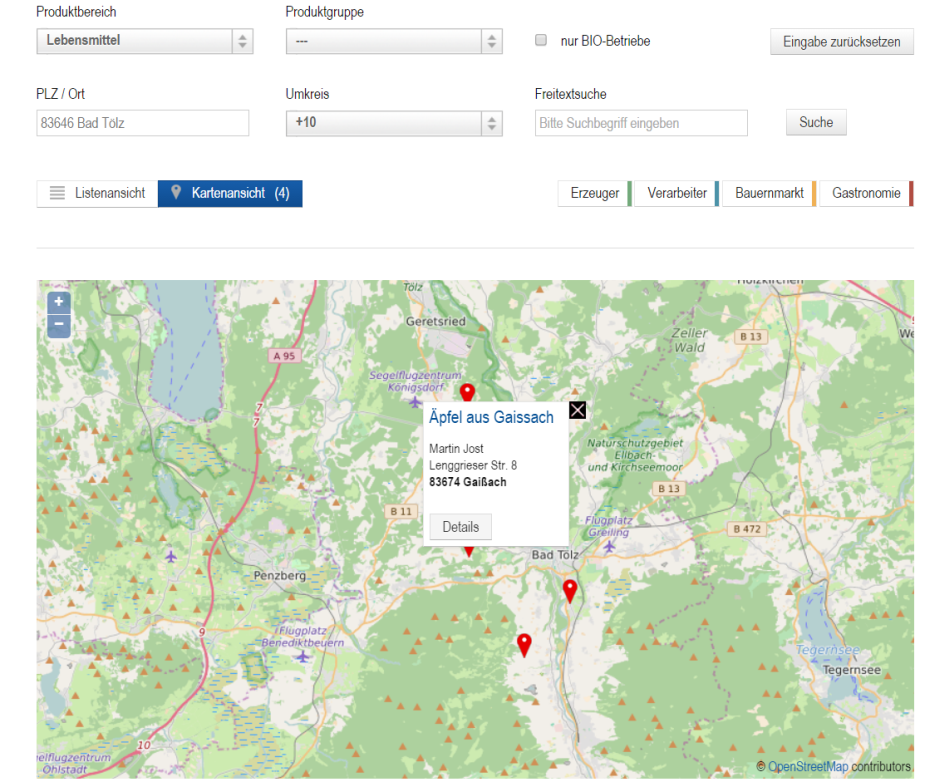 Das Verbraucherportal www.regionales-bayern.de bietet Unterstützung bei der Suche nach lokalen Anbietern von landwirtschaftlichen Produkten. , Initiativen und Veranstaltungen. Die jeweilige Suche zeigt die Ergebnisse auf einer Bayernkarte, so dass der Interessent gut zum Anbieter finden kann.