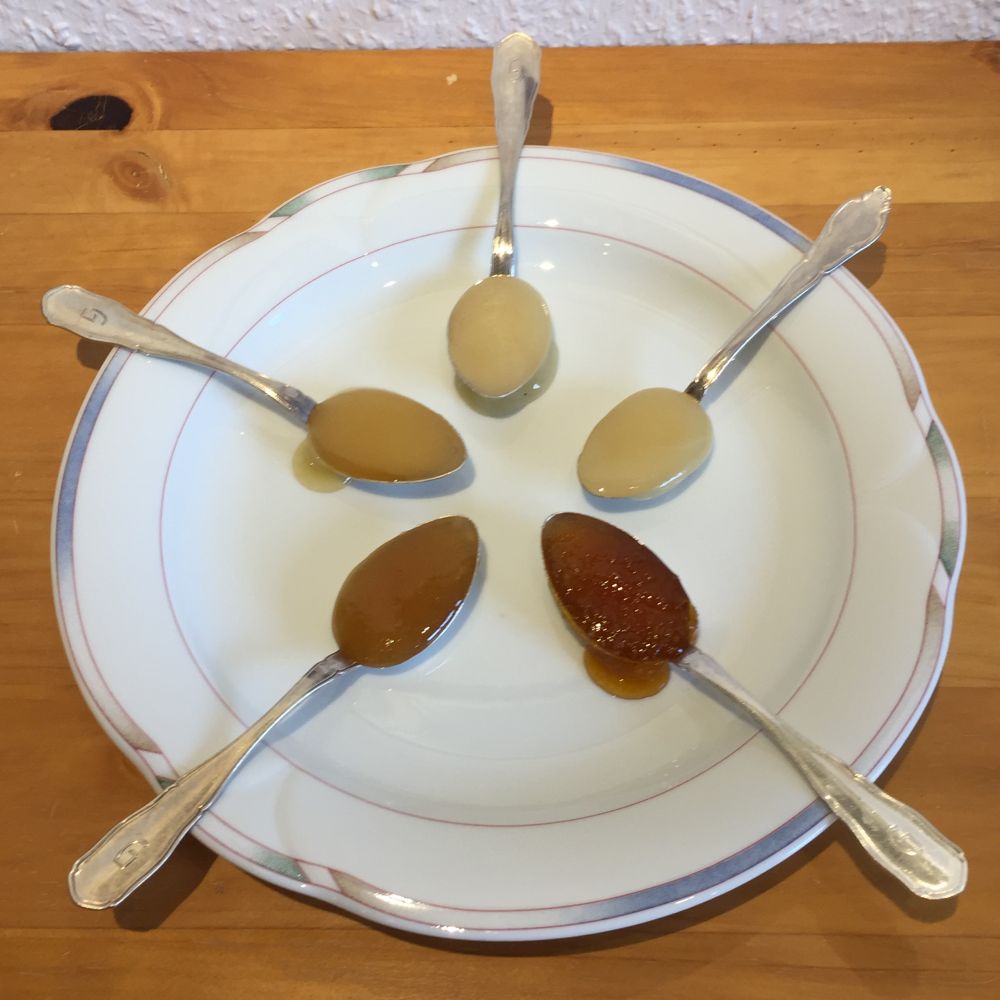 Zum Schluss stand der Kastanien-Honig in der Probe. Dieser hat besonders grobe Kristalle, die sogar zwischen den Zähnen knirschen. Er duftet kräftig, animalisch. Herb würzig ist er.